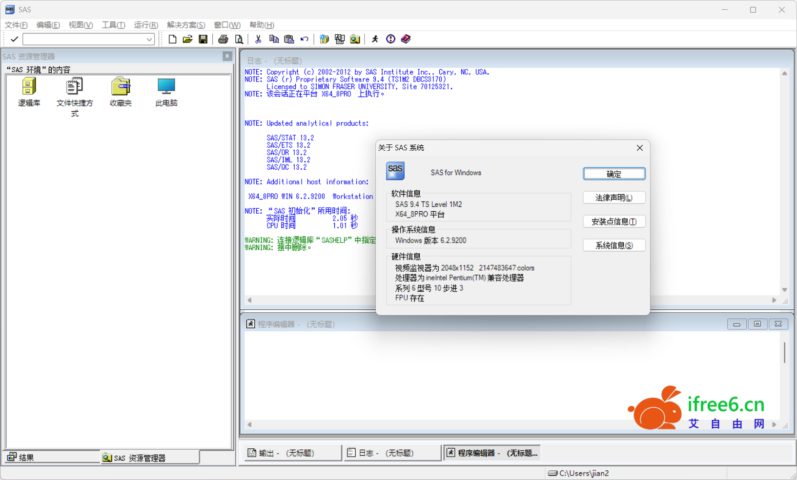 SAS9.4 是一个比较常见的版本, 这个版本可以在windows上单机部署, 也可以部署在服务器上。SAS9.4除了基础的Base SAS以外, 还有统计, 质量检测, 发展规划, 预测, 矩形运算等30多个模块, 是当前市场上统计分析软件的默认标准。SAS系统由众多模块组成, 其中Base SAS模块是SAS系统的核心, 其它各模块均在Base SAS提供的环境中运行, 用户可选择需要的模块与Base SAS一起构成一个定制化的SAS系统。