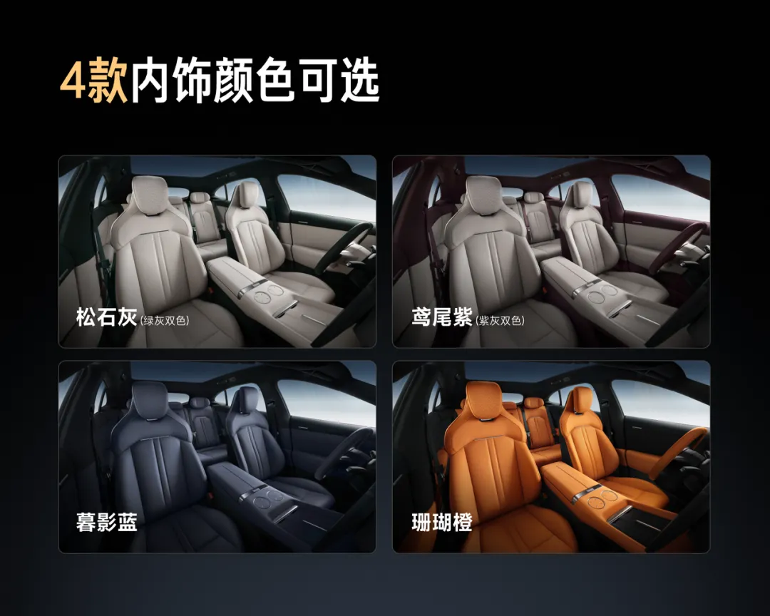 小米YU7共有四款内饰颜色,款款出色:松石灰(绿灰双色)、珊瑚橙、暮影蓝、鸢尾紫(紫灰双色)。