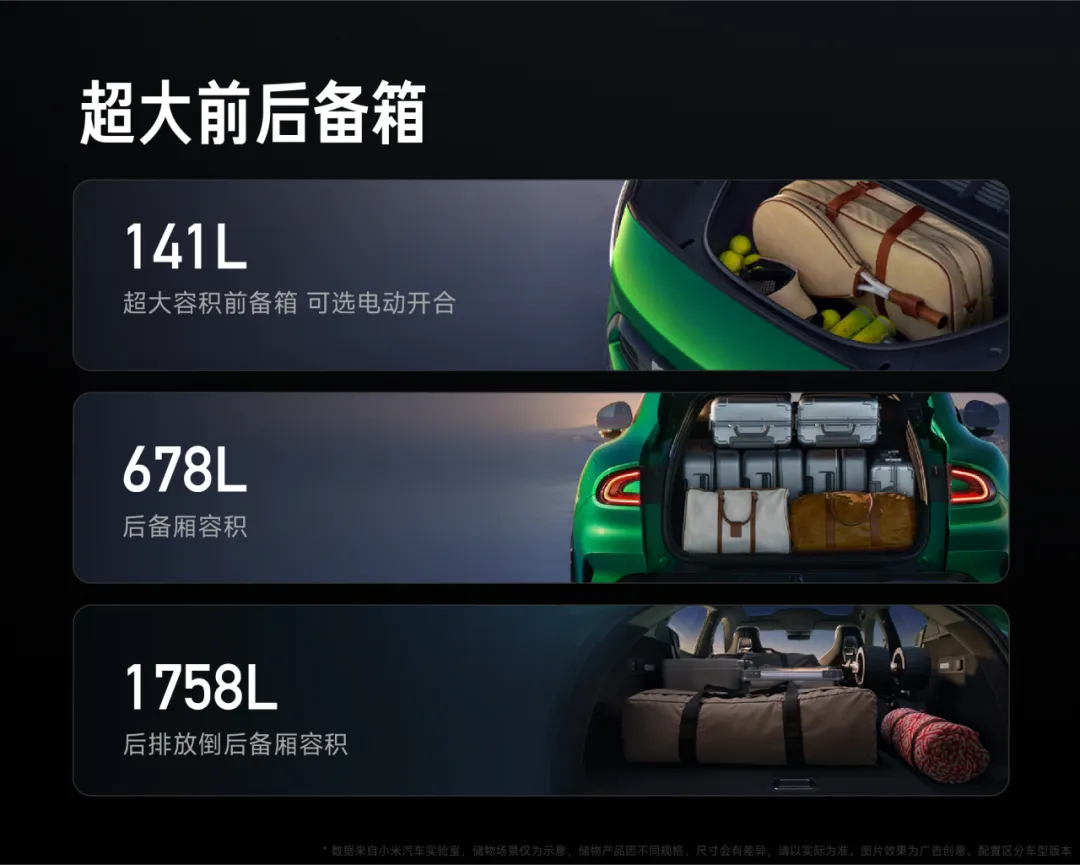 小米YU7低趴优雅的造型下,拥有舒适够用的大空间。在空间开发阶段,以身高1.88米的假人做开发,前排头部空间达100mm,后排头部空间为77mm,后排膝部空间为73mm。后排座椅靠背,支持一键电动向前放倒功能,后排秒变1.8米“大床”,满足多样化的使用场景。在储物方面,小米YU7同样出色。全车共设有36处收纳位,前备箱141L,后备厢678L,后排放倒后容积可达1758L,轻松应对日常通勤与家庭出游的各类储物需求。还有很多贴心的收纳设计,超大密码手套箱搭配专属开发的收纳盒,让物品取放更方便整洁。后排桌椅下方还设计了一个抽屉,可用于存放毛毯或小朋友的玩具等物品。