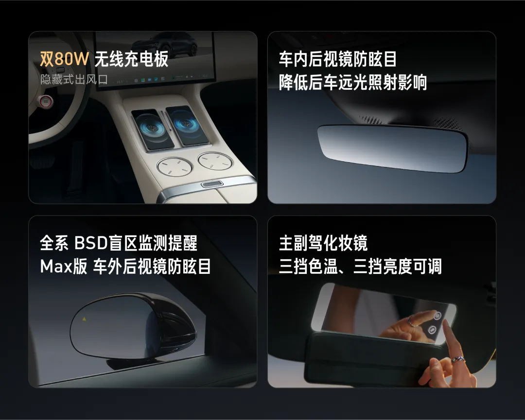 小米YU7豪华舒适体验,同样显现于每一处的细节。配备双80W无线充电板;车内后视镜防眩目功能,有效降低后车远光照射带来的影响;全系BSD盲区监测提醒,Max版还配备车外后视镜防眩目;主副驾化妆镜三挡色温、三挡亮度可调,满足不同场景需求。还有4.6L的车载智能冰箱,具备冷暖功能;25扬声器豪华音响系统,支持杜比全景声,带来全方位豪华听觉盛宴。车载空调采用柔感健康风设计,带来更舒适健康的体验。获SGS金标认证的HEPA高效空气滤芯,全车6层深度净化,有效过滤空气中的有害物质。