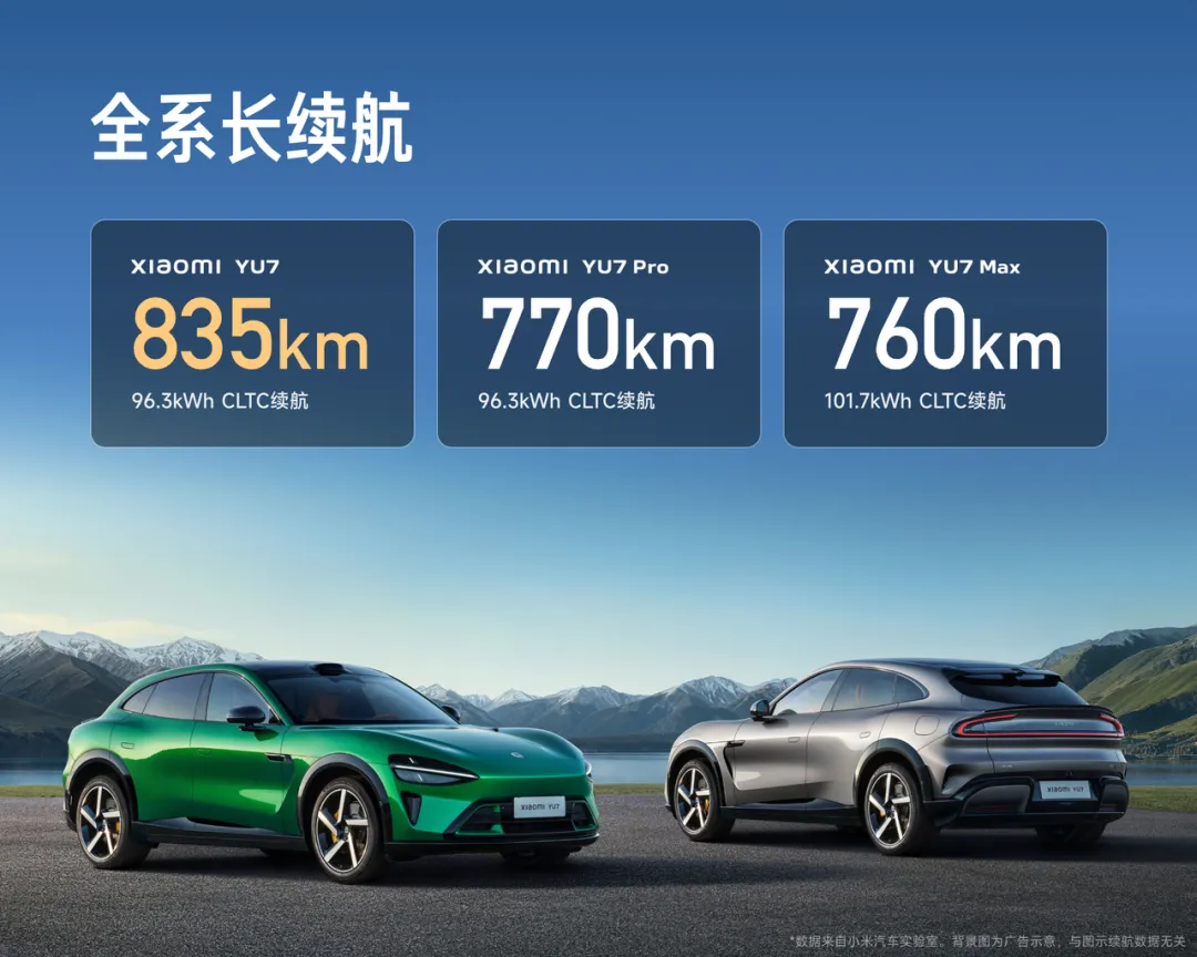 小米YU7 ——小米首款豪华高性能SUV,小米YU7,寓意御风而行。小米YU7延续家族化设计语言、提供9款豪华配色。座舱以科技、豪华、舒适为核心,空间宽敞舒适,高频接触面100%软质包覆,结合丰富的智能生态配件,打造科技豪华舒适的乘坐体验。搭载小米超级电机V6s Plus,零百加速3.23秒,配合豪华底盘系统,兼顾操控与舒适。全系采用800V碳化硅高压平台,最高续航达835km,实现更长续航与更快充电。小米天际屏全景显示,带来更贴近直觉的视觉交互体验;“超级小爱”首次上车,支持车外唤醒和全车多路同说。全系标配高规格辅助驾驶硬件及小米端到端辅助驾驶。车身结构采用超高标准2200MPa小米超强钢,配合多项主被动安全配置,全面保障行车安全。