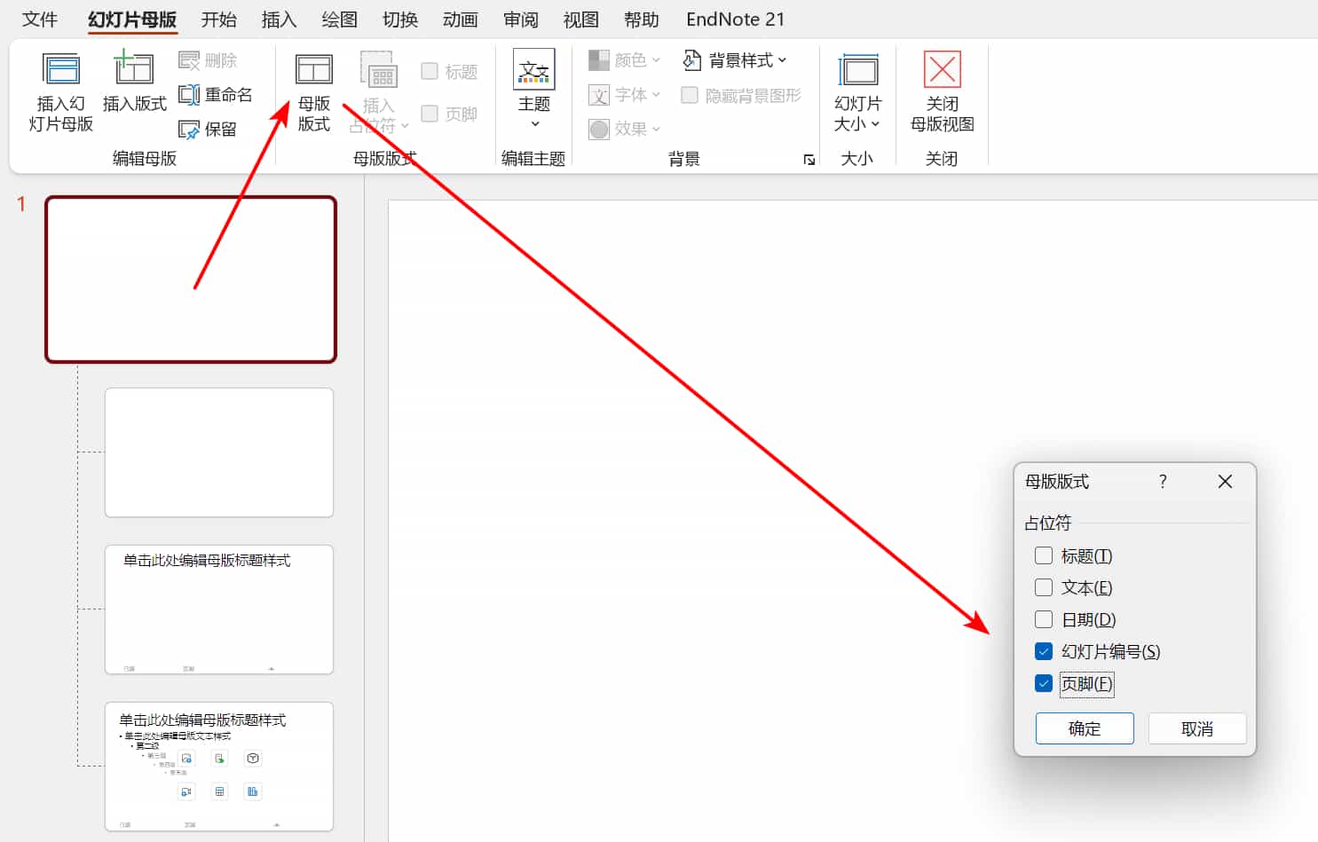 3.点击最上面一张缩略图(母版),点击“母版版式”,勾选“幻灯片编号”和“页脚”,点击“确定”(如图)。【这一步是关键,插入不成功大多是这里没勾选】