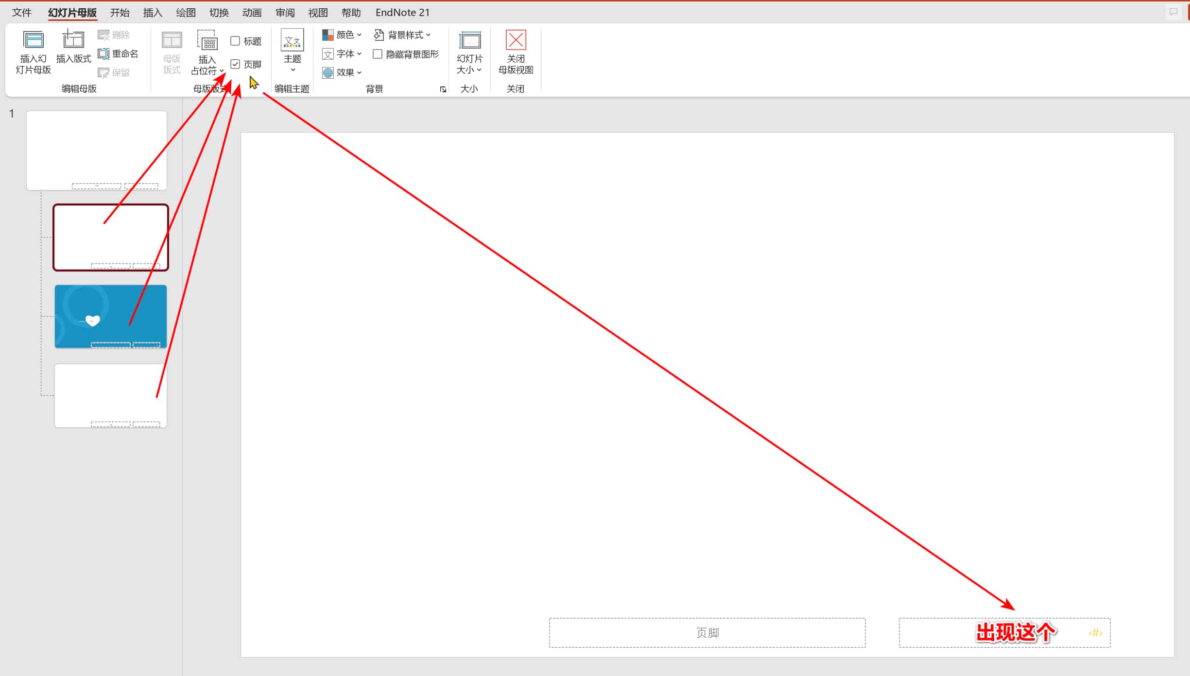 4.点击每张小缩略图,在菜单“幻灯片母版”下,依次勾选“页脚”,直接幻灯片右下角出现“<#>”,表示添加插入位置成功(如图)。