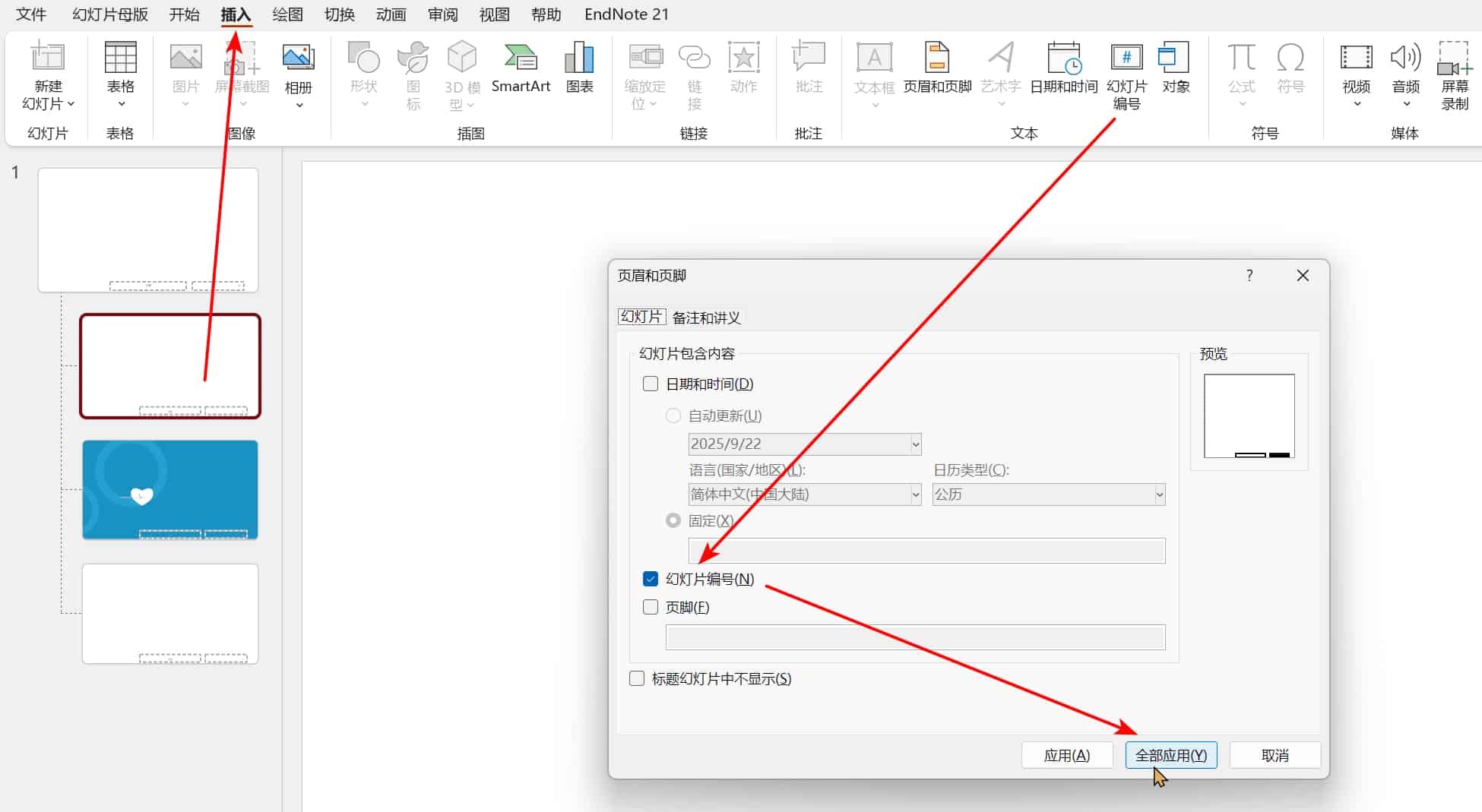 5.现在随便点击一张缩略图,点击顶部菜单“插入”下的“幻灯片编号”,勾选“幻灯片编号”,点击“全部应用”既可。