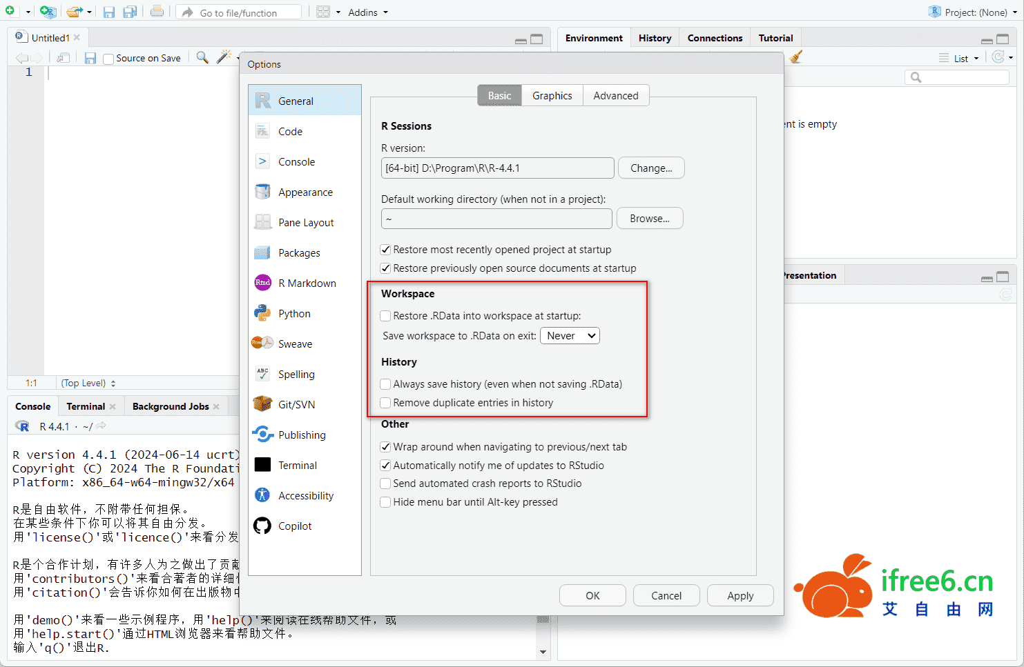 ③如果每次打开 Rstudio 非常慢,可以将这几个选项取消掉(如下图):