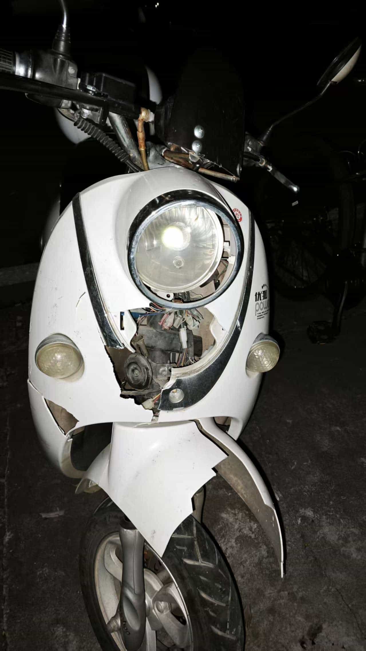 事情是这样,11月18日晚。我正骑着勇哥的小电驴从师大的南门(咸嘉湖校区)进来,我一直靠右行驶(我的车灯是坏的),刚好到宿舍楼下了,在拐角处(停在这里的轿车挡住了视野,晚上也没有路灯)一名女生骑着电动车直接朝我这边骑来(她居然靠左行驶),由于我的对向车有两辆小电驴开过来,所以我选择了让速不让道,于是就撞上了,车况如图所示。车直接断电不动了。