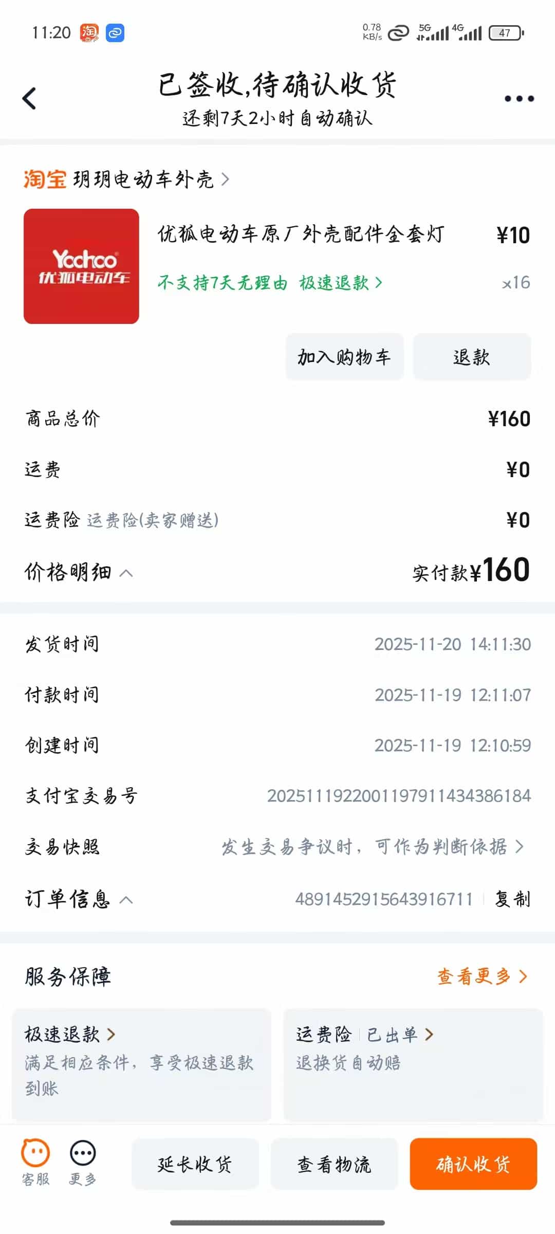 但是他这边没有相似的车壳,建议我自已到网上订。于是我花160块在淘宝买了一副类似的(前面的外壳+挡泥板)。过了4天左右才到货(听说是要到工厂里去喷漆还是啥的,有点耗时)。