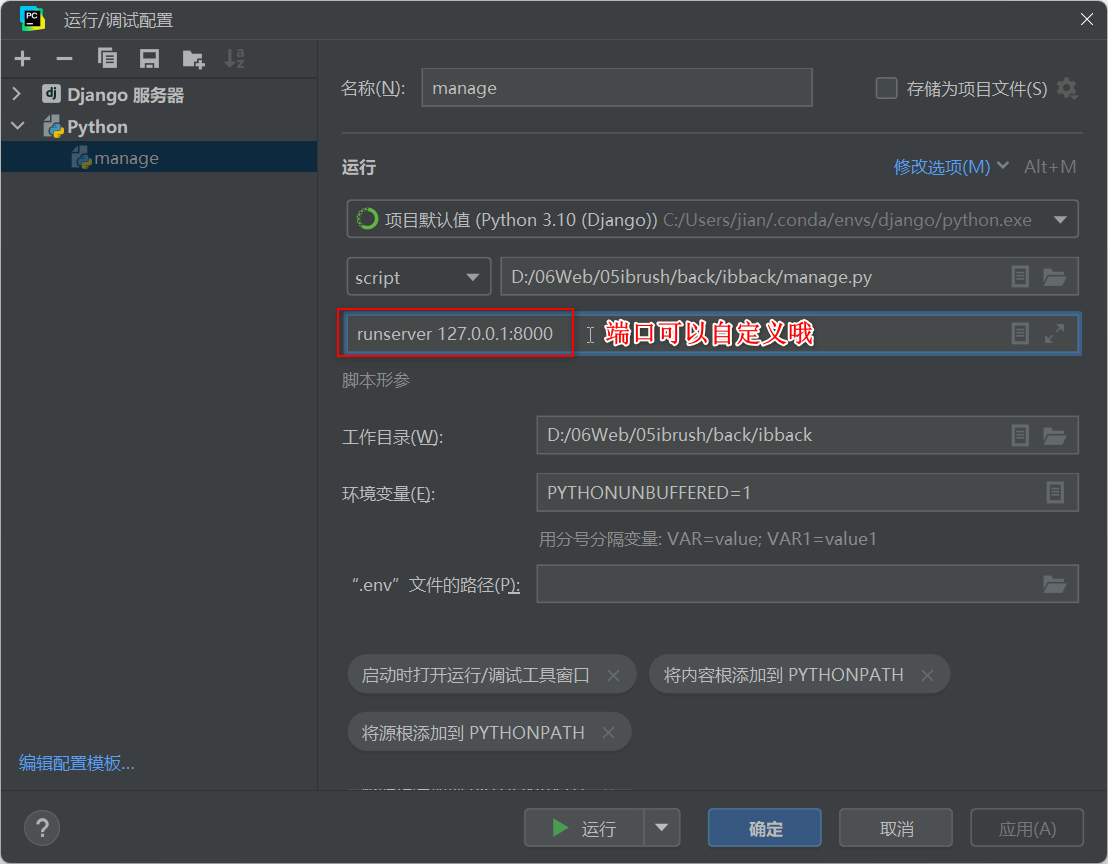 (4)Pycharm 保存 Django 的运行参数(以后直接运行 manage.py 文件即可打开网站):①先运行一下 manage.py ,出错后不用管,点击 Pycharm 右上角的 “编辑配置”,填入运行的参数即可(如下图)。